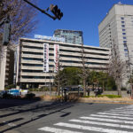 さて、フェンスに囲まれた空き地と並走する道は上り坂となり、旧永田町小学校(廃校)の南西角にある交差点で、空き地が右へ大きく“カーブ”を描きます。そのまま坂を上った交差点で空き地は終了。ここまでが補助21号線の計画ルートであり、その終点は、自民党本部の目の前です。