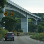 また、この区間では2021年に廃止された旧JR日高本線が最も海側を、並行する高台を国道235号が走っていますが、国道も苫小牧市~浦河町間の約7割が津波浸水想定区域になっているといいます。日高道は国道よりもさらに高い丘陵地を通り、深い谷を高架橋でまたいで津波浸水区間を回避しています。